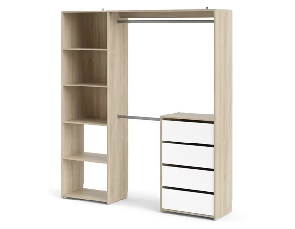 Ce dressing décor imitation chêne avec 4 tiroirs dispose d'une large colonne pour 2 piles de vêtements et de grands tiroirs pour plus de rangement.